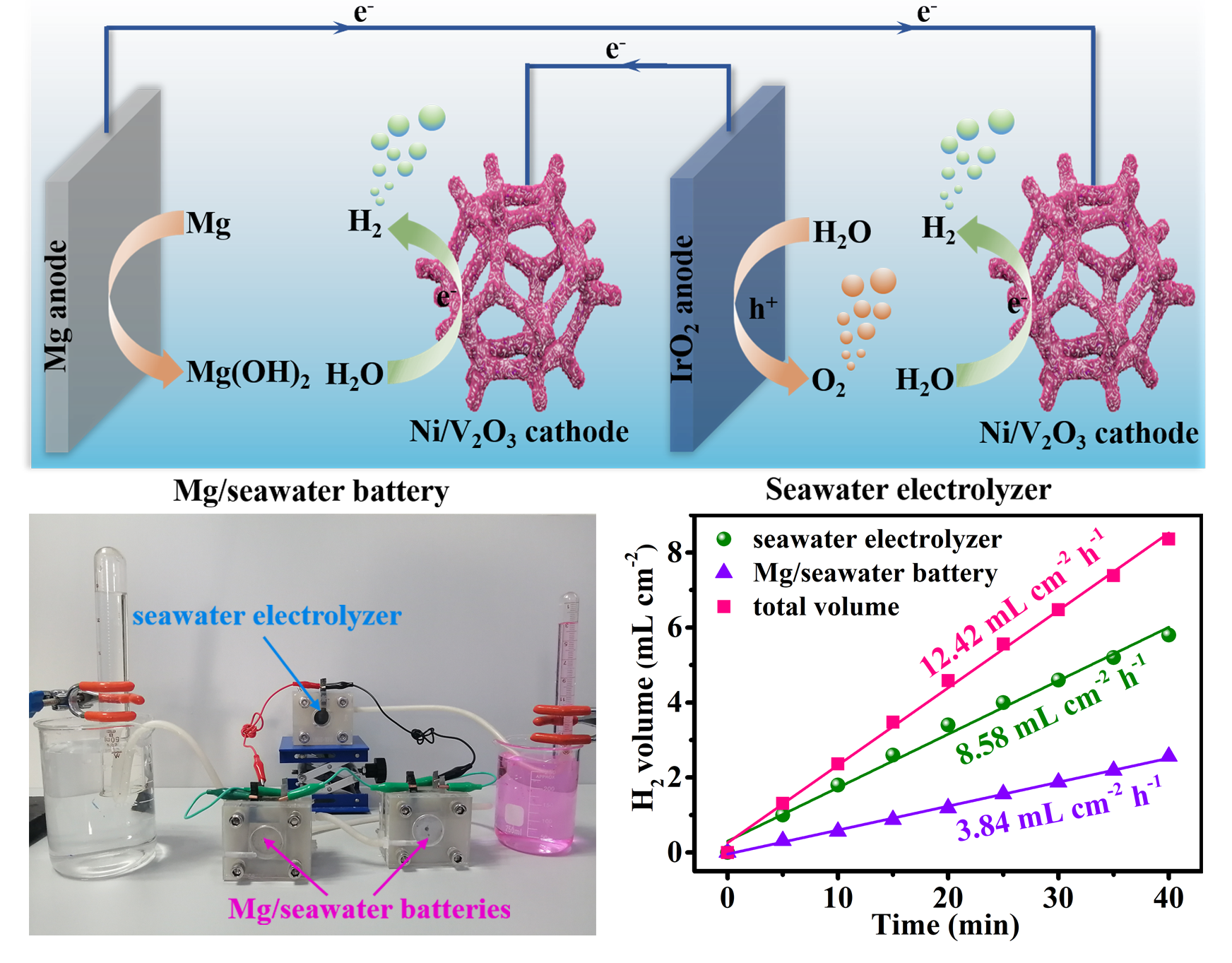 进一步,作者将该电极作为镁/海水电池和海水电解单元的阴极,并将二者进行耦合,设计了一套基于Ni/V2O3肖特基电极的自驱动海水电解制氢系统(图3)。在该系统中,镁/海水电池为电解海水装置提供电能,电解海水装置和镁/海水电池的阴极共同产生氢气,制氢效率显著提升。结果表明,Ni/V2O3肖特基电极的镁/海水电池最大输出功率密度可达17.81 mW cm-2;所构建的镁/海水电池驱动的海水电解制氢系统产氢速率高达12.42 mL cm-2 h-1,镁-氢转换效率超过80.87%,是目前报导的最先进的自驱动海水制氢系统之一。