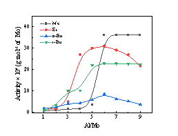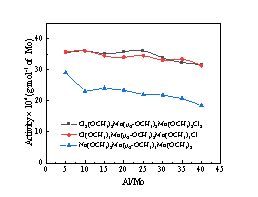 其中[Cl2(OC2H5)2Mo(μ2-OC2H5)2Mo(OC2H5)2Cl2]作为催化剂前驱体,即使将钼配合物与丁二烯的摩尔比(nMo/ nBd)设置为7.5 × 10-5,催化活性仍可达6.1 × 105g/mol,聚丁二烯中乙烯基的质量分数为86.5 %。此含有乙氧基桥连双核钼基催化体系是迄今为止报道的钼系催化丁二烯1,2配位聚合最有效的催化体系,并且该活性数值达到现有工业化镍系顺丁的催化剂体系活性数值,拥有了钼系丁二烯的立体定向高效聚合的工业生产价值。