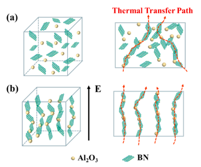 本研究通过场效应的方法在高分子基体中直接实现构筑氧化铝、氮化硼的垂直贯穿导热通道(如图1),制备具有良好导热性能的复合材料。