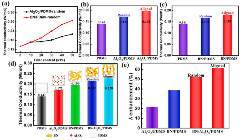 图2(a)单一填料对导热的影响;(b)和(c)填料取向形成通道对导热的影响:(d)协同效应和导热通道对复合材料的共同影响;(e)导热率的提升百分比。