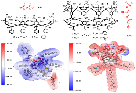 接下来,课题组从具有较大输水腔体的杯芳烃入手,通过引入静电作用、氢键、输水作用并调整腔体尺寸,构建了对具有重要生理意义的焦磷酸盐及溶血性磷酸等的离子载体及高选择性传感器,通过密度泛函理论计算进一步证实了其高选择性。这类传感器可实现矿泉水及血液样品中的焦磷酸盐及溶血性磷酸的快速准确检测,具有重要的应用前景。相关成果以“Highly Selective Potentiometric Sensing of Biologically Relevant Pyrophosphate and Lysophosphatidic Acid Using N-Alkyl/Aryl Ammonium Resorcinarenes/Extended-Resorcinarenes as Ionophores”为题发表在自然指数期刊、分析化学类顶级期刊Analytical Chemistry(一区TOP期刊,文章链接:https://pubs.acs.org/doi/abs/10.1021/acs.analchem.2c01819)上,该论文以365英国上市公司官网为唯一单位。