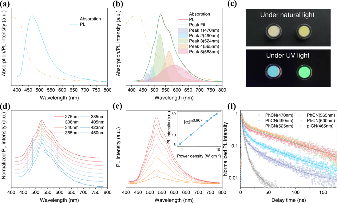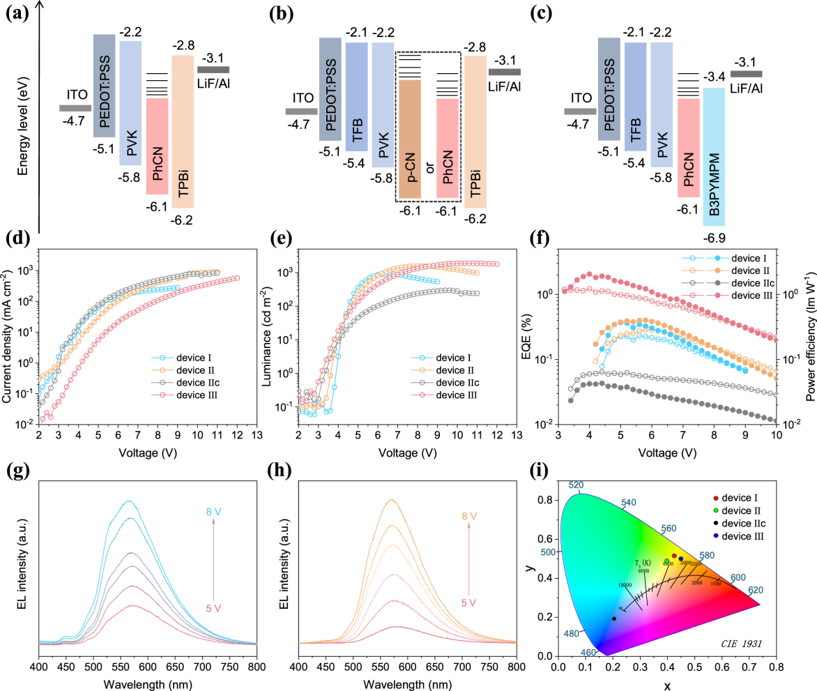 对此,邢军、王磊教授团队开发了一种芳香化的氮化碳材料作为单组分发光层的暖白光LED器件。苯基修饰可以增强氮化碳材料三-s-三嗪结构的刚度,减弱电子-声子耦合,从而显著提高光致发光量子产率从5%到40%。采用真空沉积法制备基于芳香化氮化碳材料的WLED,并通过优化电荷注入工艺提高器件的性能。最终,优化后的器件表现出低开启电压3.2V,高亮度1885 cd m-2,电致发光光谱半峰宽达到110 nm,色坐标为(0.44, 0.52),相应色温为3700K。该研究开拓了低成本氮化碳材料在单组分WLEDs领域的应用,为低成本WLEDs的发展提供一条新途径。