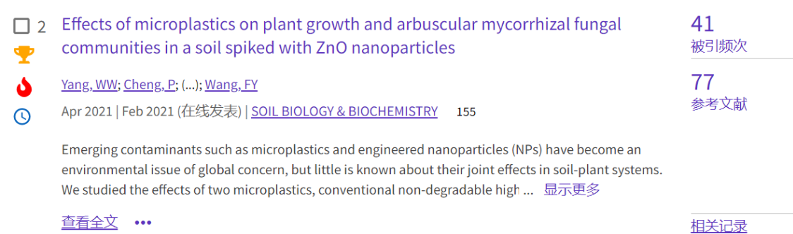 (2)论文2发表于土壤类top期刊《Soil Biology and Biochemistry》(https://doi.org/10.1016/j.soilbio.2021.108179),累计被引41次,该论文也同时入选高被引论文。该文报道了传统难降解微塑料高密度聚乙烯(HDPE)、可生物降解微塑料聚乳酸(PLA)和纳米氧化锌对植物生长及锌积累的效应,并评估了它们对丛枝菌根真菌群落结构的影响,为认识微塑料和纳米颗粒的生态风险提供参考。
