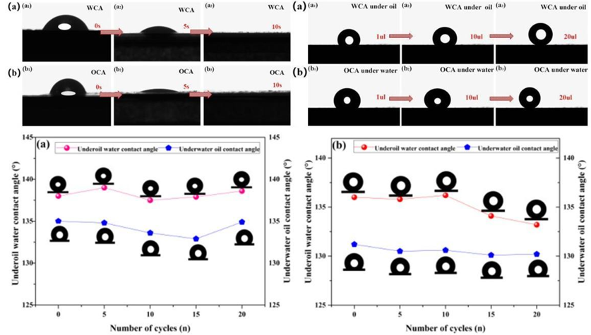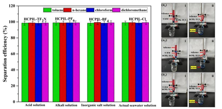 此外研究了HCPIL-Cl、HCPIL-BF4、HCPIL-PF6和HCPIL-TF2N等超湿润材料在苛刻条件下仍具有极高的油水混合物分离效率。这一发现充分表明,这些材料具有良好的耐酸、耐碱和耐盐性以及研究了不同批次的HCPIL-TF2N材料上对甲苯和水的油水分离实验。在本条件也可实现各类湿润材料的连续分离与回收问题。使用后的超湿润材料经简单乙醇/水交替洗涤后,可重新进行连续化分离实验,并且所得到的分离效果与之前的分离效果大致相同,可以进行至少20次以上的循环实验。成功验证了四类超湿润材料具有极长的循环实验周期。