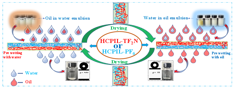 化工学院盖恒军、宋红兵团队创新性的将离子液体与其他不同的辅助交联剂(苯胺,苯甲醇以及甲苯)进行反应,通过扩展网络中的长链共轭结构,所得超交联聚离子液体具有丰富的多孔结构、高稳定性、可重复使用性的新型功能材料。在之前工作中,实现了依据交联不同的辅助交联剂,成功制备出一系列不同功能化的超交联聚离子液体,能够分别实现不同类型的油水混合物。(相关工作发表在中科院工程技术一区TOP期刊Separation and Purification Technology,2022,285,120407. DOI: 10.1016/j.seppur.2021.120407以及获得授权专利ZL202110855270.0)。在此基础上,课题组又将超交联聚离子液体进行离子交换(BF4-1, PF6-1和TF2N-1),其中所获得的两种聚离子液体(HCPIL-PF6和HCPIL-TF2N)它们可以根据相应的溶剂变化在超亲水性和超亲油之间自由切换,适用于分离许多油水混合物,尤其对乳化油实现了智能分离。