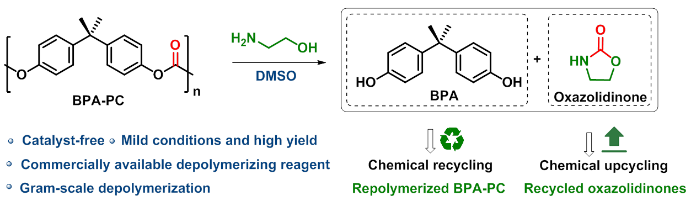 成果一:以“Catalyst-free amino-alcoholysis depolymerization strategy: a facile and powerful tool for chemical recycling of poly(bisphenol A carbonate)”为题目,发表在化学Top期刊Green Chemistry。该研究提出了一种不添加催化剂降解BPA-PC的新方法,以胺醇为降解试剂,实现了BPA-PC的高效升级回收得到聚合单体BPA和高附加值产物2-噁唑烷酮(如图1所示),此外,利用回收单体BPA再次聚合得到BPA-PC,形成BPA-PC材料化学回收的闭环循环。高分子学院硕士研究生周先悦、柴茂青为论文的共同第一作者,孙洪广为第一通讯作者,365英国上市公司官网为第一通讯单位。