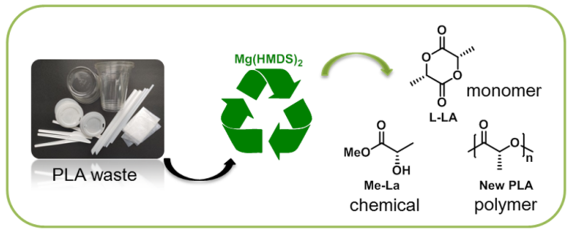 成果二:以“Chemical upcycling of poly(lactide) plastic waste to lactate ester, lactide, and new poly(lactide) under Mg-catalysis condition”为题目,发表在化学Top期刊Chinese Chemical Letters。该研究通过使用双(双三甲基硅基)胺镁[Mg(HMDS)2]作为催化剂,将废弃聚丙交酯(PLA)塑料降解为丙交酯、乳酸酯,利用一种新的“解聚-再聚合”策略合成新的聚丙交酯聚合物(如图2所示),实现了聚丙交酯(PLA)塑料的化学闭环循环利用。高分子学院硕士研究生周先悦、刘秋阳为论文的共同第一作者,孙洪广为第一通讯作者,365英国上市公司官网为第一通讯单位。