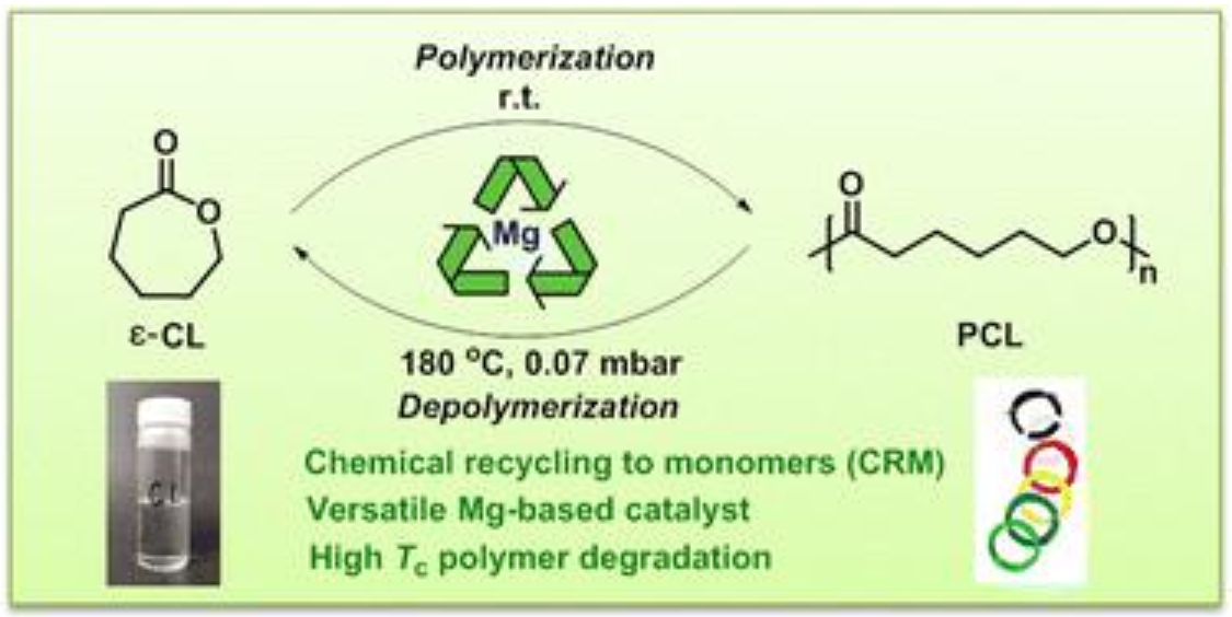 成果三:以“Closed-loop chemical recycling of poly(ε-caprolactone) by tuning reaction parameters”为题目,发表在Polymer Chemistry期刊。该研究首次报道了以双(双三甲基硅基)胺镁[Mg(HMDS)2]作为催化剂,实现“ε-CL到PCL再到ε-CL”的聚合单体闭环循环和“PCL到ε-CL再到PCL”的聚合物闭环循环过程(如图3所示),建立了商业医用材料PCL的循环生命周期。高分子学院硕士研究生苏家丰为论文的第一作者,孙洪广为第一通讯作者,365英国上市公司官网为第一通讯单位。