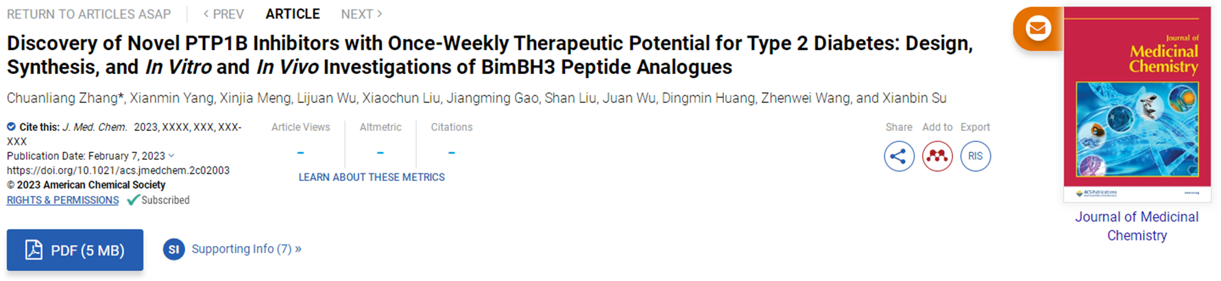 近日,我校化工学院张传亮团队在新型长效降糖药物设计与发现研究方面取得新进展,相关成果以“Discovery of Novel PTP1B Inhibitors with Once-Weekly Therapeutic Potential for Type 2 Diabetes: Design, Synthesis, and In Vitro and In Vivo Investigations of BimBH3 Peptide Analogues”为题发表在国际药物化学领域顶级期刊《药物化学杂志》(Journal of Medicinal Chemistry)(影响因子8.039,中科院1区Top期刊)。