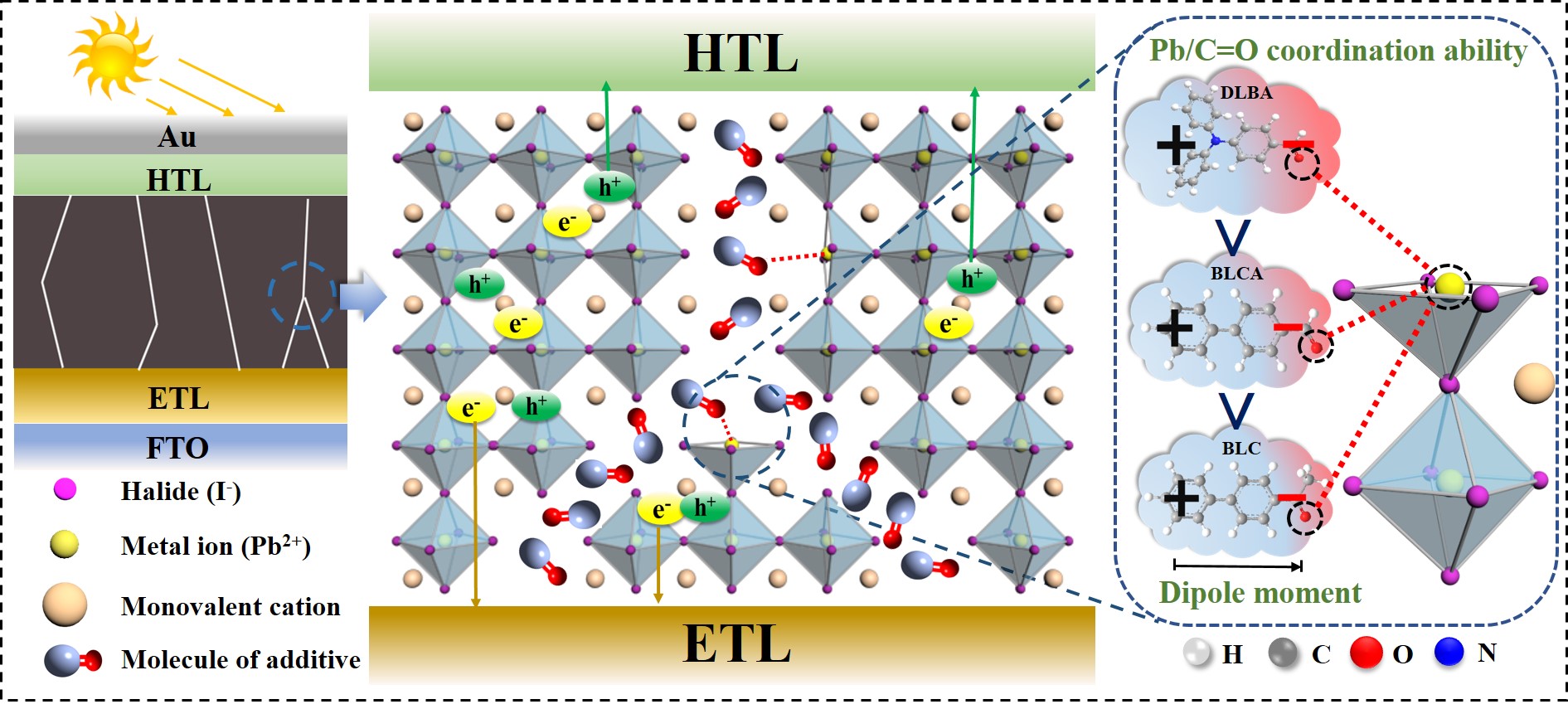 近日,化工学院青年教师蒋晓庆副教授与中科院青岛生物能源所逄淑平研究员、中科院大连化物所郭鑫研究员等研究人员合作,将羰基添加剂的分子偶极子工程用于制备高效稳定钙钛矿太阳能电池。