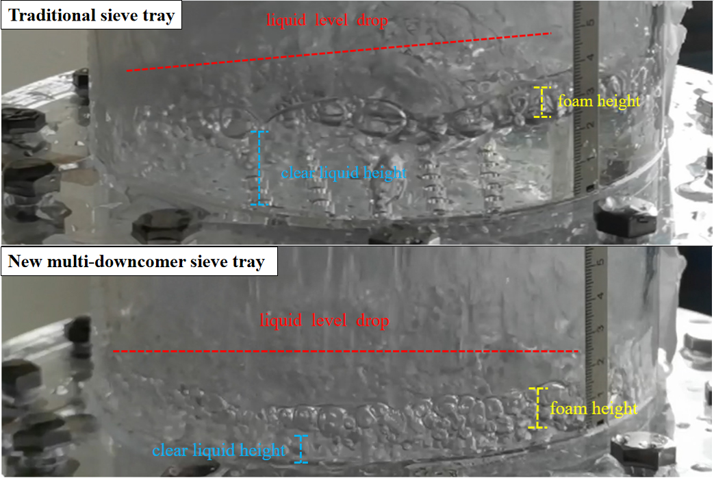 同时,王伟文团队将理论研究成果推广至气液传质塔板研发工作中,阐释了气泡受迫破碎机制和规律,提出了“液滴破泡”的气泡调控方法,发明了一种新型多降液管微气泡塔板,改善了两相接触,大幅度提高了气液相界面积,可高效实现工业生产分离过程强化。该工作以“A new gas-liquid mass transfer enhancement method for a multi-downcomer sieve tray: Bubble breakup by falling droplets”为题发表在流体力学领域Top期刊Physics of Fluids上(doi:10.1063/5.0131700),365英国上市公司官网为论文的唯一单位。