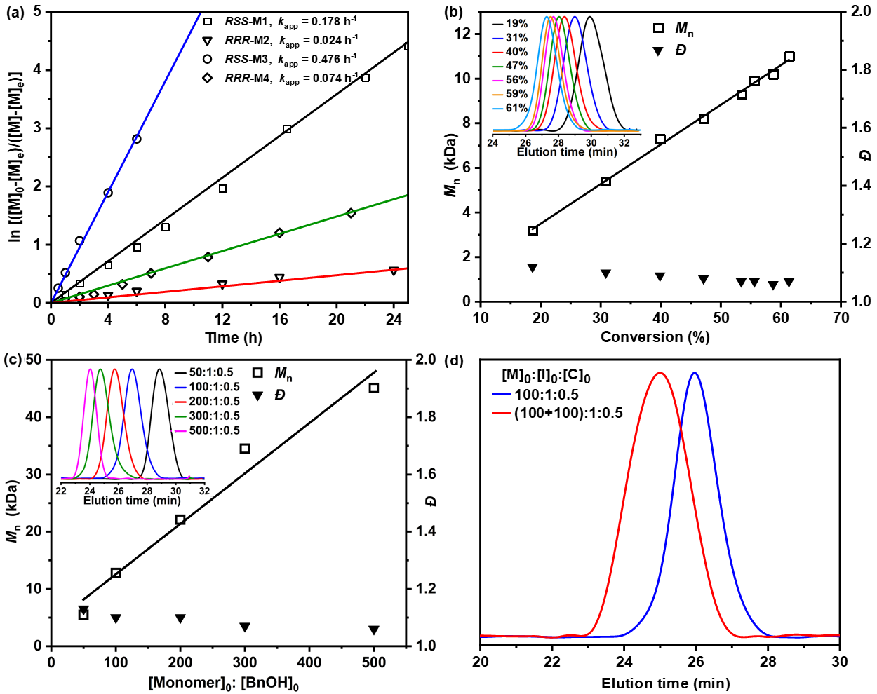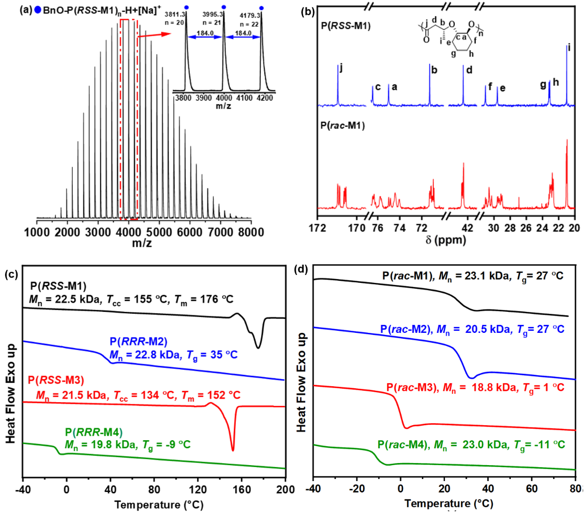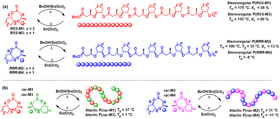 这项工作揭示了取代基和手性对单体聚合热力学、动力学以及所得聚酯的结晶性质的影响。研究结果表明,RSS构型的单体相比RRR构型尽管在热力学上不利于开环聚合,但却具有更高的动力学聚合活性。通过核磁碳谱证明开环聚合过程中不发生手性消旋,得到了立体规整的聚醚酯。值得一提的是,与无规立构聚合物相比,所得立构规整性聚酯表现出很好的结晶性质,并且熔点高达176 °C,高于商品化聚乙烯和聚丙烯塑料。