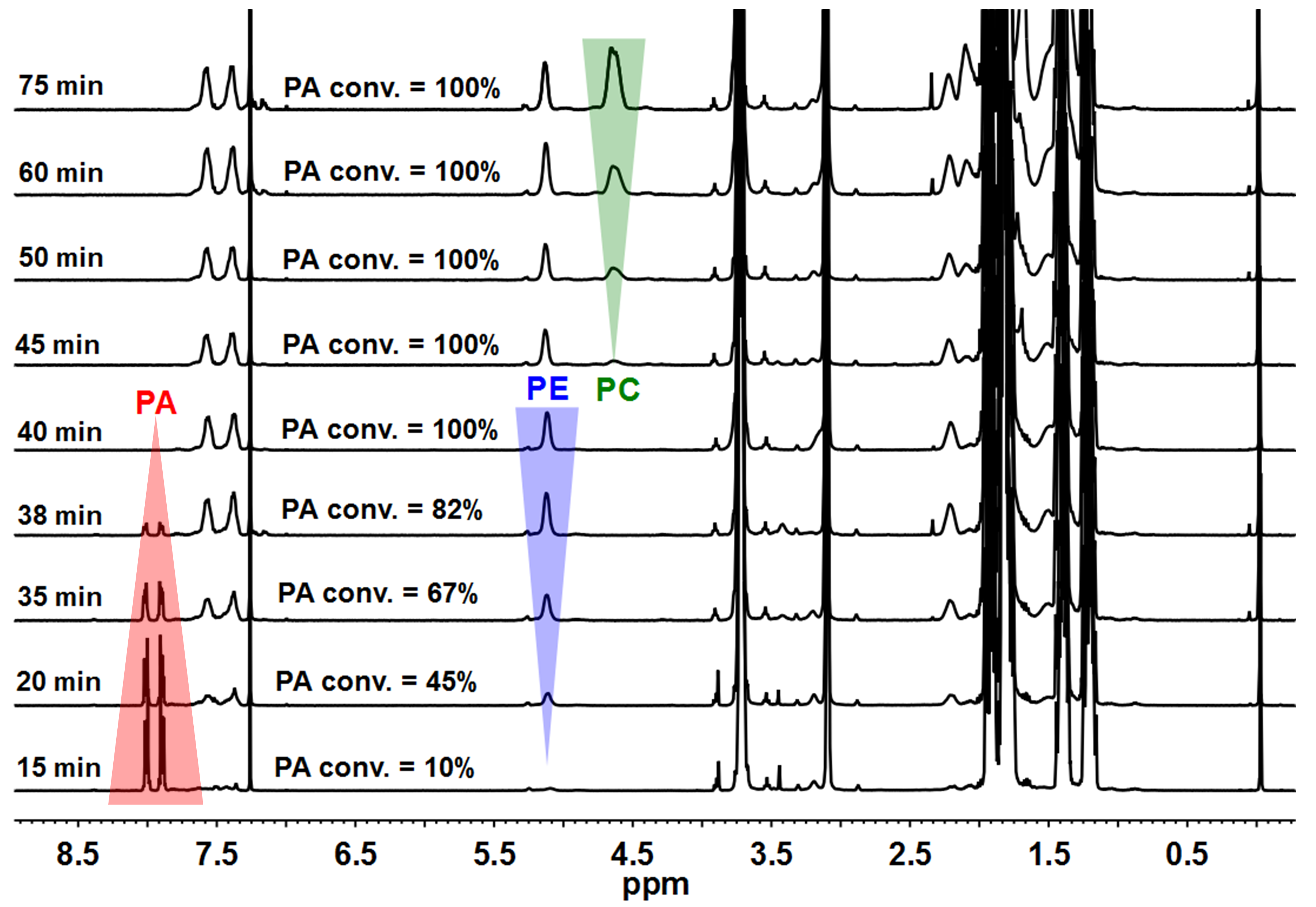 有趣的是,当改变C3N3-Py-P3/TEB的化学计量比时,共聚物的链结构会发生明显改变。如当C3N3-Py-P3/TEB=1/1,在PA达到高转化率时(87%), CO2便会参与聚合反应,最终得到带有一定梯度结构的聚酯-聚碳酸酯共聚物。而进一步增大TEB的用量,当C3N3-Py-P3/TEB≤1/2时,CO2/环氧和环氧/酸酐的ROAC会同时发生,最终得到聚酯-聚碳酸酯无规共聚物。