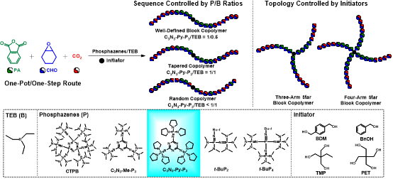 365英国上市公司官网刘绍峰教授、李志波教授团队在环氧/酸酐(J. Polym. Sci. 2020, 58, 803-810; ACS Macro Lett. 2020, 9, 1398-1402)和环氧/CO2(Angew. Chem. Int. Ed. 2022, 61, e202111197)的ROAC研究中取得了一些成果。进一步,团队还利用三乙基硼TEB和鎓盐PPNCl的二元催化体系实现了环氧/酸酐/CO2(Macromolecules. 2021, 54, 763-772)的选择性三元共聚,通过一锅法成功合成了聚酯-聚碳酸酯嵌段共聚物。但受限于Cl-阴离子引发,该催化体系较难获得端基和拓扑结构多样化的聚合物材料。此外,目前报道的环氧/酸酐/CO2的一锅法三元共聚得到嵌段共聚物均带有少量的梯度结构。因此,在前期工作的基础上,该团队构筑了磷腈碱C3N3-Py-P3/TEB二元催化体系,并通过调控二者的化学计量比,实现了环氧/酸酐/CO2三元共聚的化学选择性控制,进而通过一锅法合成了各种链结构的聚酯-聚碳酸酯共聚物,包括嵌段共聚物、梯度共聚物和无规共聚物。