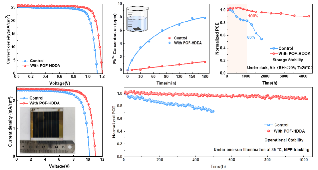 化学院周忠敏教授团队与合作者报道了一种有机小分子单体八氟-1,6-己二醇二丙烯酸酯(OF-HDDA)引入钙钛矿薄膜通过末端烯烃发生原位交联形成聚合物(POF-HDDA),获得高性能高稳定性且低铅泄漏的器件与模组。POF-HDDA克服了小分子波动大、扩散系数高、在钙钛矿内部分布不均匀等缺点。该文章提出了通过热交联形成聚合物的策略,羰基锚定钙钛矿中未配位的Pb2+,减少铅的泄漏。同时通过钝化内部Pb相关和I相关缺陷调节钙钛矿膜的结晶,降低陷阱密度,释放晶格应变,促进载流子的运输和提取。进而获得高性能高稳定的低铅泄漏的器件和模组。