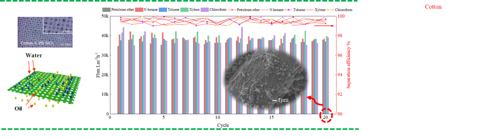 此油水分离膜具有优异的耐磨性,机械性能,耐腐蚀性和热稳定性,可应用于各种严苛环境下的油水分离。此制备方法反应条件温和,可在棉布表面进行大面积施工,此材料超疏水领域和油水分离领域,具有良好的应用前景。