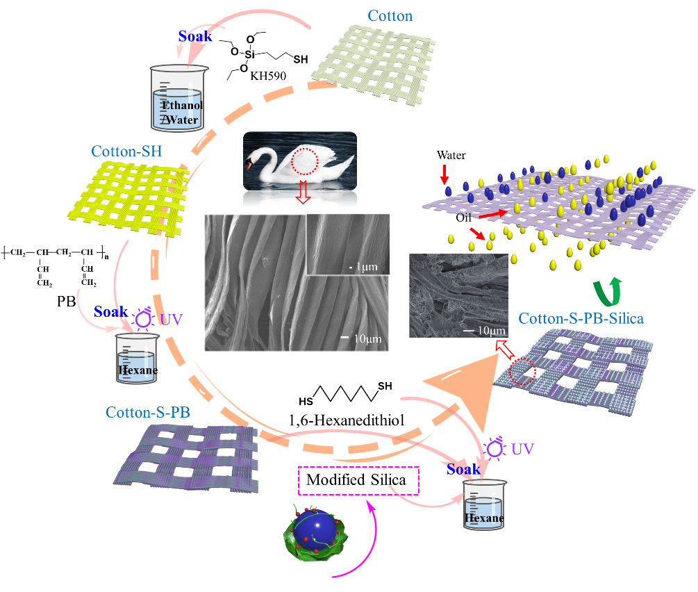 更多信息请参见Progress in Organic Coatings(中科院一区TOP)期刊上“Swan feather-spired fluorine-free superhydrophobic self-cleaning cotton cloth with strong oil-water separation function”为题发表的论文(https://doi.org/10.1016/j.coco.2023.101566)。第一作者为365英国上市公司官网高分子科学与工程学院博士研究生刘玉冬,通讯作者为华静教授。此研究工作得到了山东省自然科学基金的支持。