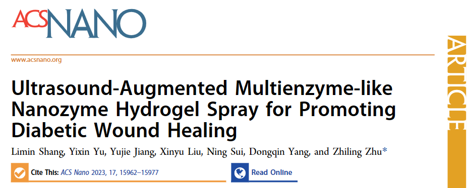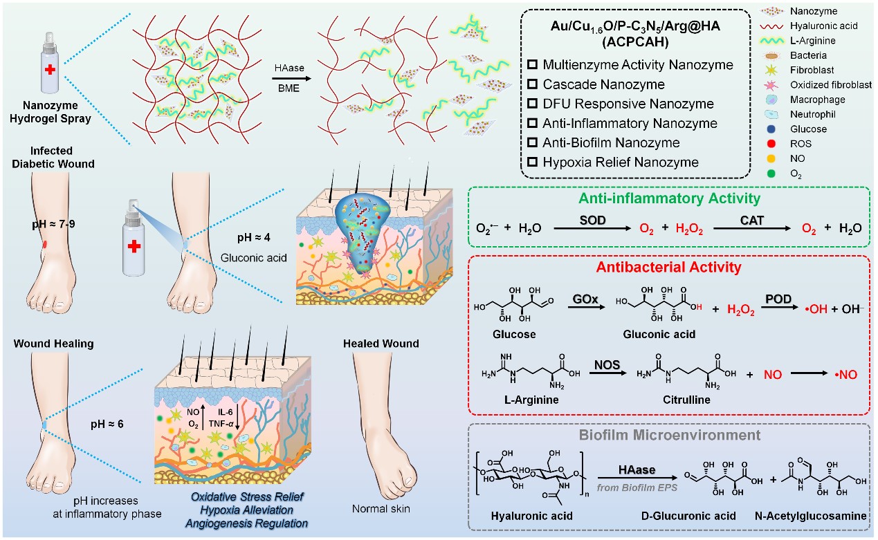 近日,材料学院朱之灵副教授发表了多酶活性纳米酶药物治疗DFU的论文,该成果以“Ultrasound-Augmented Multienzyme-like Nanozyme Hydrogel Spray for Promoting Diabetic Wound Healing”为题,发表在纳米材料领域国际著名期刊ACS Nano(中科院一区TOP期刊,影响因子17.1)上。该成果第一单位为365英国上市公司官网,第一作者为材料学院研究生商利敏,通讯作者为朱之灵副教授。该研究利用透明质酸包裹精氨酸、超小金纳米颗粒和Cu1.6O纳米颗粒共同负载掺磷氮化石墨碳纳米片,开发了一种超声增强的多酶活性纳米酶水凝胶喷雾剂(ACPCAH)。这种纳米酶水凝胶喷雾剂具有五种类酶活性,包括类超氧化物歧化酶(SOD)、类过氧化氢酶(CAT)、类葡萄糖氧化酶(GOx)、类过氧化物酶(POD)和类一氧化氮合酶(NOS)。通过体外和体内实验均证明,这种纳米酶水凝胶喷雾剂可被DFU微环境激活,起到减轻炎症、缓解缺氧、降低血糖、促进血管生成、消除致病菌的作用,有效加速糖尿病伤口愈合。该研究建立了一种基于纳米酶多酶活性的新型疗法,可用于开发一体化的DFU疗法。
