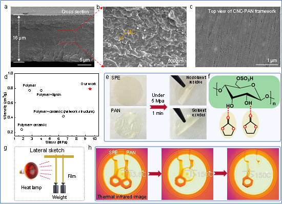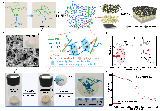 采用该法制备的固态电解质膜厚仅有16μm,且具有良好的耐热性。CNC表面丰富的磺酸基和其他含氧极性官能团可以溶剂化Li+,帮助Li+移动,作为Li+运输的桥梁,降低SPE中的能量势垒,从而提高离子的电导率。PAN中腈基之间的偶极-偶极相互作用可以结合EC分子形成快速离子传输通道,进一步提高离子电导率。