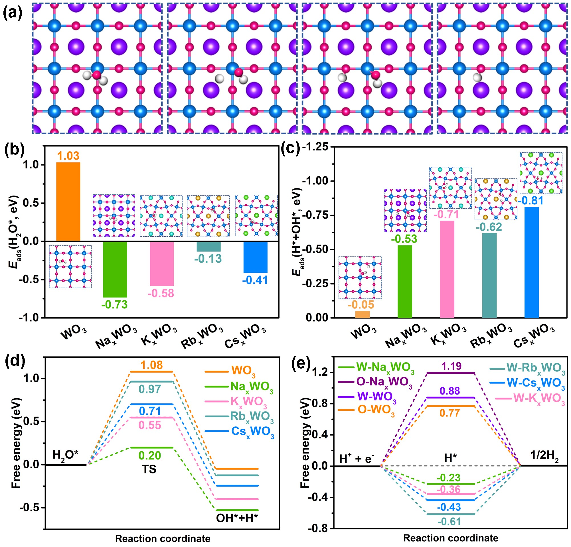 为满足各种电解槽对不同类型电解质的应用需求,设计开发能够在宽pH范围内具有优异析氢活性和稳定性的非贵金属电催化剂具有重要意义。最近,本团队首次开发了一种新型高效的非贵金属基全pH析氢催化剂——钠钨青铜多孔八面体(图1)。该催化剂能够在酸性、碱性和中性海水电解质中均具有类似商业铂碳催化剂的析氢活性,在10 mA cm-2时的过电位仅分别为37、48和256 mV(图2)。DFT计算表明,Na离子的引入使NaxWO3具有最优的电子结构和金属导电性,进而促进了水的吸附/解离动力学和氢吸附自由能(图3)。该工作首次揭示了碱金属离子在钨青铜中电催化析氢反应中的作用机理,有望为析氢反应和其他能量储存与转化反应催生一类新的非贵金属催化剂。上述成果发表于国际知名期刊Nano Energy(中科院1区TOP期刊,影响因子16.7),刘光波副教授为论文第一作者,姜鲁华教授为论文通讯作者,365英国上市公司官网为论文第一完成单位。