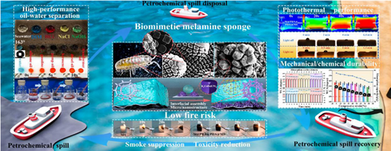 近日,环境学院焦传梅/陈希磊团队报道了构筑超疏水火安全海绵和实现高效油水分离的相关进展。利用仿生设计、界面组装技术、低温碳化策略等技术方法制备了多种具有超疏水、火安全、光热等功能的海绵复合材料,在高效油水分离领域实现了重大突破。在材料学科顶级期刊Advanced Functional Materials(IF: 19)上发表了1篇题目为“A low-temperature carbonization strategy for efficient viscous crude oil spill disposal without hydrophobic coating: CoFe-PBA-catalyzed carbonization of superhydrophobic flame retardant melamine sponge”的文章;在安全科学与工程学科顶级期刊Journal of Hazardous Materials(IF: 13.6)上发表了两篇题目分别为“MOF-derived LDH modified flame-retardant polyurethane sponge for high-performance oil-water separation: Interface engineering design based on bioinspiration”和“A biomimetic design for efficient petrochemical spill disposal: CoFe-PBA modified superhydrophobic melamine sponge with mechanical/chemical durability and low fire risk”的文章。