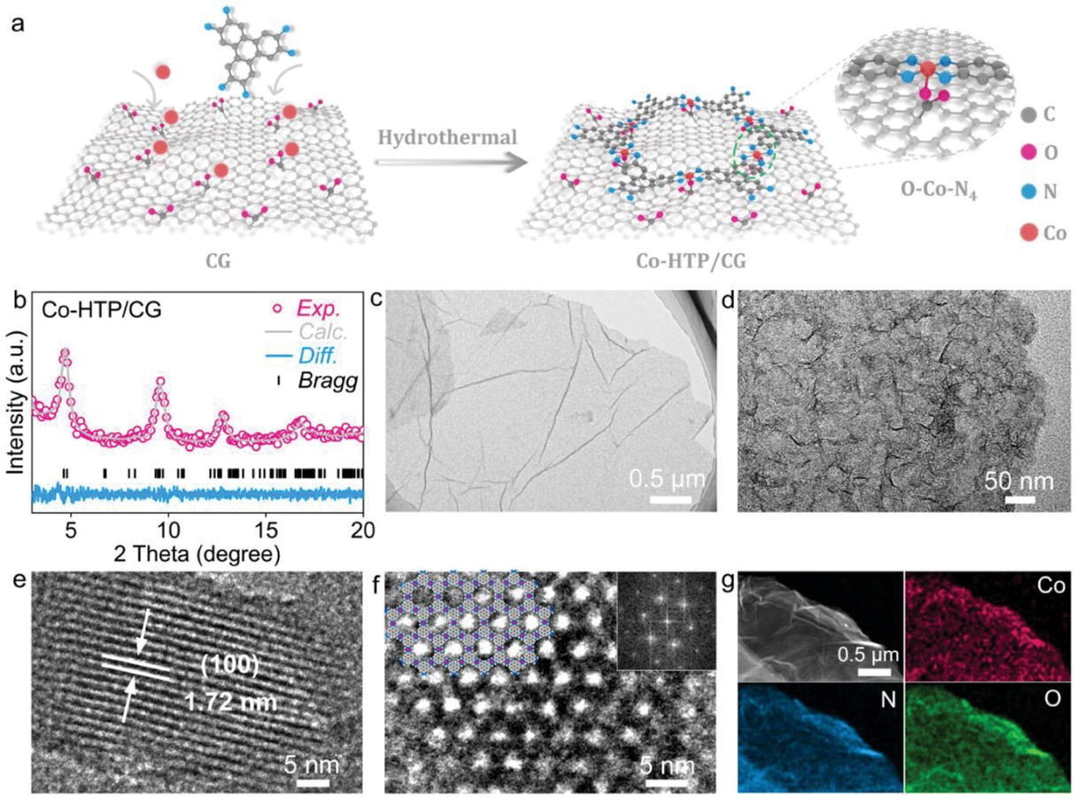 图1. (a) Co-HTP/CG的形成过程示意图。(b) Co-HTP/CG的XRD图谱和Rietveld精修。(c,d) Co-HTP/CG的TEM图像。(e,f) Co-HTP/CG的HRTEM图像。(g) Co-HTP/CG的HAADF-STEM和元素分布图像。