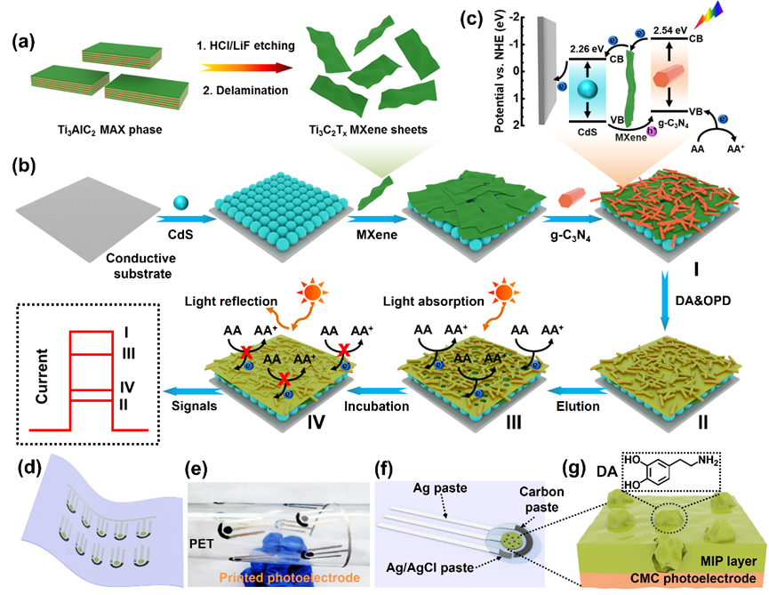 综上所述,本工作通过丝网印刷将CMC电极与MIP层集成到柔性PET基底上来实现实时、非侵入性的DA监测。由于在CdS量子点和g-C3N4之间集成了高导电性且柔性的MXene,并进行了适当的能级匹配,相较于传统的光电材料,CMC电极不仅在界面处形成了内建电场,促进了电子-空穴对的分离效率,还具有良好的柔性,可以实现实时、非侵入性的DA检测。因此,这项工作成功地证明了用于灵敏DA检测的柔性PEC传感器的可扩展开发,在实时和无创医疗监测领域将拥有巨大的应用前景。