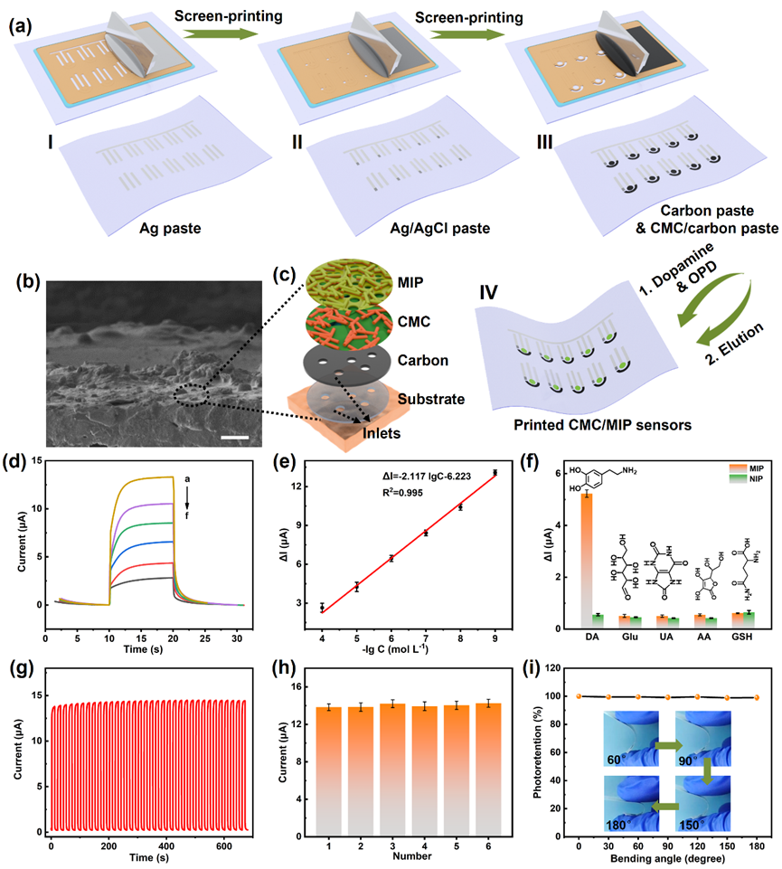 图2. 丝网印刷规模化制备CMC/MIP传感器的过程以及应用于多巴胺的检测选择性、灵敏性,稳定性等检测。