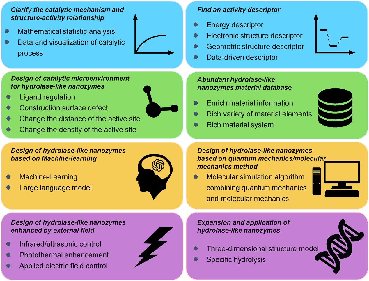 (4)水解纳米酶的数据驱动设计方法:随着水解纳米酶的不断发现,研究材料的范围快速扩展。然而,依赖试错法发现新材料存在局限性。对水解纳米酶的大量计算与实验数据的分析促成了数据驱动设计策略的诞生。该策略系统地收集、整理和分析数据,并结合物理化学等相关理论知识,从而揭示材料组成、结构、催化过程和性能之间的关联,为水解纳米酶的靶向设计提供指导。