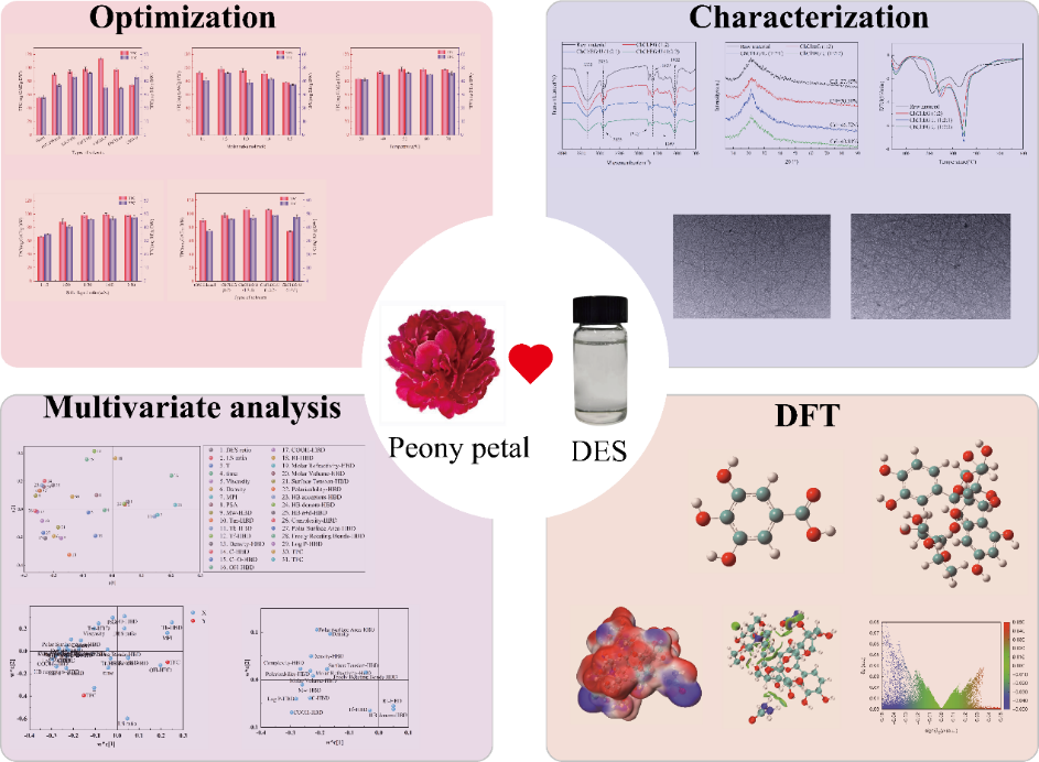 团队利用低共熔溶剂提取牡丹花瓣中酚类和黄酮类化合物,探究了八种不同类型的DES的提取效率。当氯化胆碱、乙二醇和尿素的摩尔比为1:2:2,含水量为30%时,总酚和总黄酮的提取量最高。通过多变量分析,建立了以提取量为目标的关系模型。其中,HBD的参数对总酚和总黄酮的提取量有显著影响。此外,采用量子化学计算以芦丁和没食子酸为目标分子,探究DES与目标分子的相互作用。结果表明,氢键是其中主要的相互作用力。相关研究成果以“Mechanism of deep eutectic solvents based extraction of phenolic and flavonoid compounds from peony petals”为题目,发表在知名国际期刊Industrial Crops & Products(SCI一区TOP期刊),论文DOI链接为doi.org/10.1016/j.indcrop.2024.119947。论文第一作者为化工学院2022级硕士研究生王胜林,通讯作者为徐环斐,365英国上市公司官网为第一单位和唯一通讯单位。