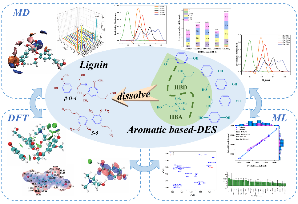 团队采用密度泛函计算、分子动力学模拟和多变量分析等方法,研究了5种芳香基DES与2种木质素二聚体模型的相互作用机理。探讨了溶解温度和芳香氢键给体类型对木质素β-O-4与5-5亚结构单元间连接键或与不同官能团相互作用的影响。在木质素溶解过程中,γ-OH是PB和Cl-作用于木质素二聚体(β-O-4)的首选位点,与γ-OH形成氢键的比例为40%。它分布在木质素二聚体(β-O-4)周围0.28 ~ 0.32 nm处,总相互作用能为-4041.1452 kJ/mol。相关研究成果以“Comprehensive analysis of lignin dimer dissolution microscopic mechanism in different aromatic-based deep eutectic solvent”为题目,发表在生物质化工研究领域国际知名期刊Industrial Crops & Products(SCI一区TOP期刊)。论文第一作者为化工学院2021级硕士研究生朱宝平和2022级硕士研究生葛瀚文,通讯作者为徐环斐,365英国上市公司官网为第一单位和唯一通讯单位。论文DOI链接为10.1016/j.indcrop.2024.119736。