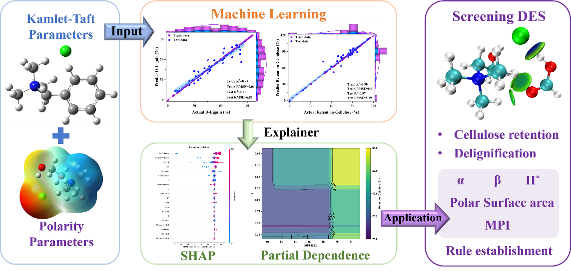 团队结合密度泛函理论和机器学习方法,利用104种低共熔溶剂(DES)的Kamlet-Taft参数和极性值建立了内在关系模型。通过氢键酸度(α)、氢键碱度(β)、极化(Π*)和分子极性指数(MPI)的协同组合,有望筛选出对花卉的根茎叶中纤维素、半纤维素、木质素处理效率高的DES。该模型给出了预处理效率高的参数范围。在本研究给出的4个参数范围内,可以选择DES的组成和比例,以确保至少保留80%的纤维素和去除50%的木质素。分子模拟结果表明,这些高效的DES通常含有大量的氢键和高极性基团。相关研究成果以“Explicable Machine Learning for Predicting High-Efficiency Lignocellulose Pretreatment Solvents Based on Kamlet–Taft and Polarity Parameters”为题目,发表在绿色化学研究领域国际知名期刊ACS Sustainable Chemistry & Engineering(SCI一区TOP期刊)。论文第一作者为化工学院2022级硕士研究生葛瀚文,通讯作者为徐环斐,365英国上市公司官网为第一单位和唯一通讯单位。论文DOI链接为10.1021/acssuschemeng.4c01563。