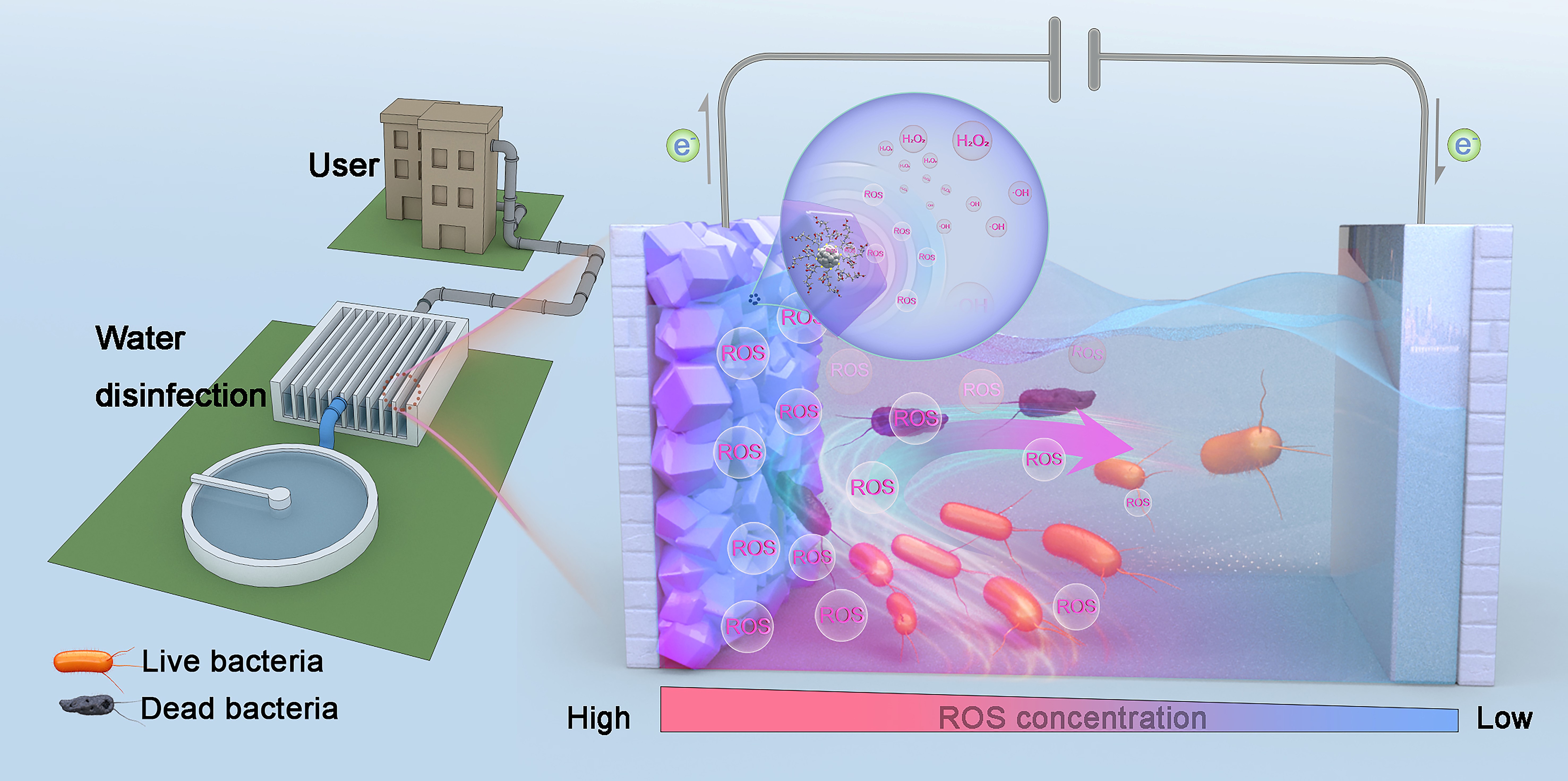 近日,我校材料学院袁勋团队在自然子刊《Nat. Commun.》上发表了题为“Simultaneous generation of residue-free reactive oxygen species and bacteria capture for efficient electrochemical water disinfection”的研究论文。面对日益严峻的全球水资源安全挑战,该团队在电化学水消毒系统方面取得突破进展:开发了一种搭载原子级精确Ag28纳米团簇电极的电化学水消毒技术,实现了高效、连续、无残留的水体消毒。通过理性设计Ag团簇基电极材料,可提供1)大量的细菌电吸附位点,用于智能细菌富集;2)Ag团簇可原位生成局部高浓活性氧(ROS),结合银本身的本征抗菌特性实现双机制细菌灭活;3)基于电化学水消毒系统的“活死细菌迭代”(即活细菌吸附→细菌灭活→死细菌脱附)效应,实现该系统的连续水消毒。实验表明,该电化学水消毒系统对革兰氏阳性菌、革兰氏阴性菌及真菌均具有超过99.99%的杀菌率,且经过40次循环使用性能仅下降0.75%,连续运行5小时以上仍可维持99.90%的抗菌效率。此外,该系统还具有低能耗、高处理通量及高环境耐受能力等特点。这项研究不仅显著提升了饮用水消毒技术的效率与可靠性,还为全球范围内的水质安全问题提供了全新的解决思路。
