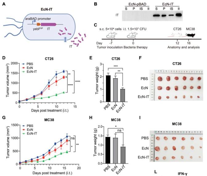 研究团队构建了一种PD-L1 靶向免疫毒素 αPD-L1-PE38,通过将抗 PD-L1 纳米抗体与临床验证的 PE38 毒素融合,使其在对肿瘤细胞展现出强大的抗肿瘤活性。为了将这种免疫毒素精准递送至肿瘤组织,顾玉超教授团队巧妙地利用了E. coliNissle 1917(EcN)靶向肿瘤组织的特性。团队通过基因工程改造EcN 菌株,通过静脉注射或瘤内注射,EcN 能够定植于实体瘤中并在肿瘤组织中释放αPD-L1-PE38 免疫毒素。实验结果显示,工程菌株在细胞和动物水平均展现出显著的抗肿瘤活性。此外,研究团队还对免疫毒素的亲和力进行了优化,优化后的免疫毒素进一步增强了对PD-L1 的结合能力和抗肿瘤活性。