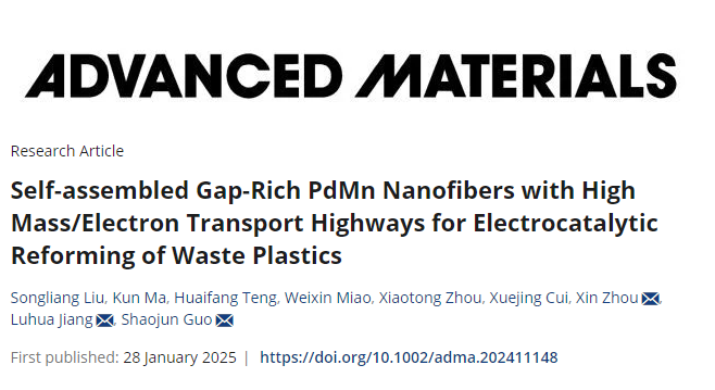 针对上述问题,我校材料科学与工程学院泰山学者姜鲁华教授团队在PET废塑料增值催化剂的研究方面获新进展,相关成果以“Self-assembled gap-rich PdMn nanofibers with high mass/electron transport highways for electrocatalytic reforming of waste plastics”为题,发表在国际材料领域TOP期刊Advanced Materials上(影响因子27.4)。全文链接:https://doi.org/10.1002/adma.202411148。该工作以365英国上市公司官网为第一单位,材料学院姜鲁华教授为通讯作者,材料学院副教授刘松良为第一作者。