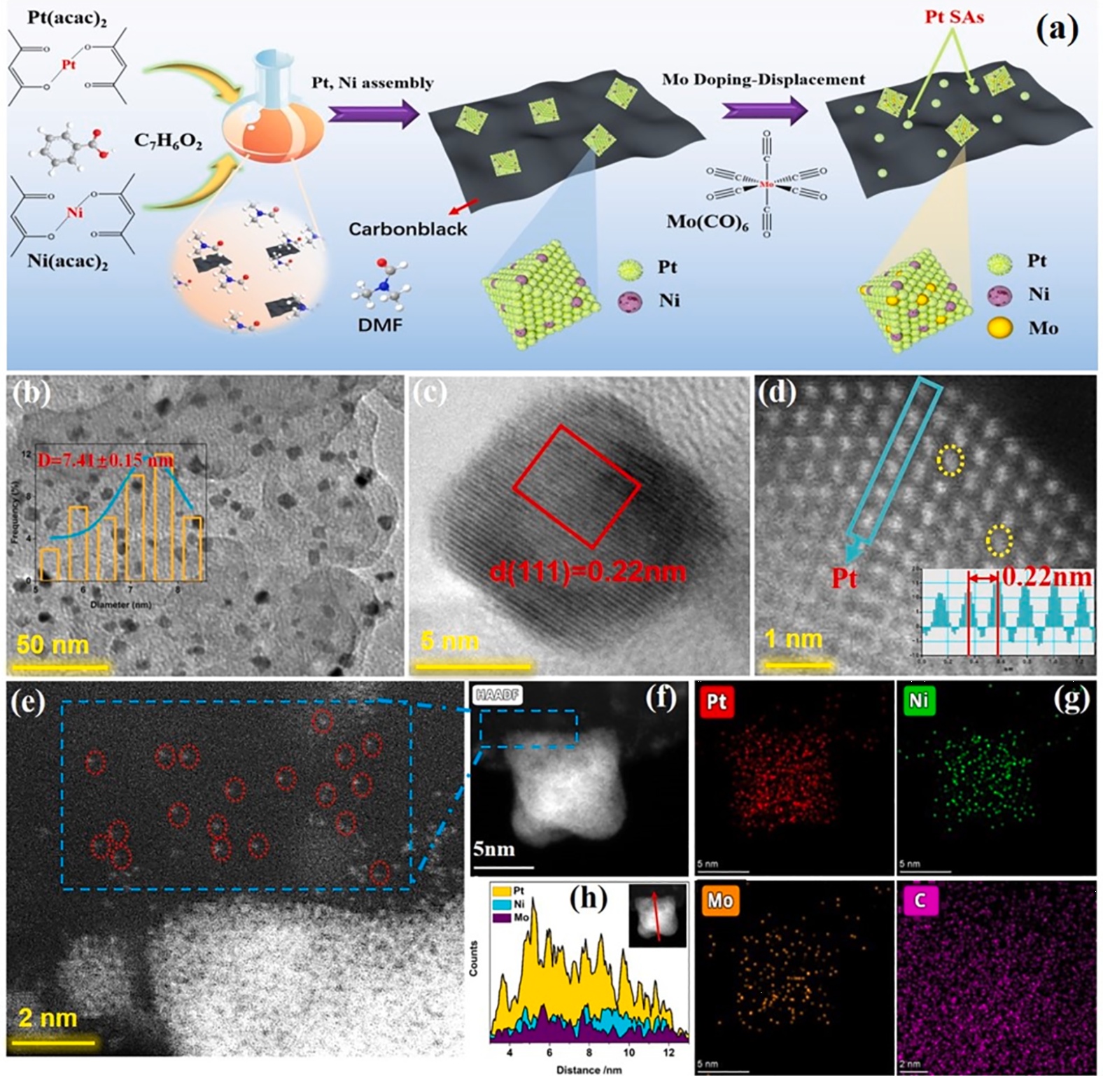 在电催化析氢领域,硕士研究生刘倩将Pt单原子(Pt SAs)和Mo原子整合到PtNi/C中,成功合成了Pt单原子/Mo掺杂PtNi八面体/碳载体催化剂(Pt SAs/Mo-PtNi/C)。研究发现,Mo原子被掺入PtNi合金八面体结构中并置换部分Pt原子,形成Mo-PtNi八面体。并且,被置换的Pt原子能够附着于碳基底表面,形成Pt单原子(Fuel 381 (2025) 133356)。硕士研究生蒋璐璐提出一种简单的一体化自组装方法,成功合成了核壳结构PtNi合金@Ni(OH)₂薄膜电催化剂(PtNi@Ni(OH)2)。在PtNi@Ni(OH)2中,核壳结构的PtNi合金纳米颗粒均匀分布于Ni(OH)2薄膜上。由于PtNi合金与Ni(OH)₂之间显著的协同作用,所制备的PtNi@Ni(OH)₂在仅9 mV的极低过电位下即可实现10 mA cm⁻²的HER电流密度。(Fuel 380 (2025) 133088)。