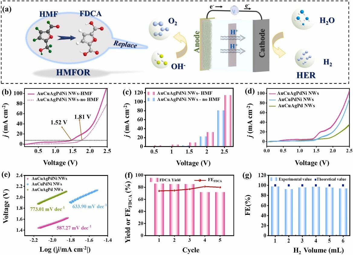 该研究采用一锅湿化学法合成了高熵合金纳米线催化剂。系统研究表明,AuCuAgPdNi纳米线具有较低的电荷转移电阻和较高的电化学表面积。此外,将HMFOR与析氢反应偶联后,实现了同步绿色HMF的氧化和H2的析出。该研究揭示了高熵合金系统的创新合成和内在催化机制,为生物质的增值转化提供了有效策略。