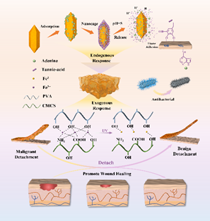 在伤口护理领域,黏附性水凝胶因能保持伤口湿润、抗菌消炎并吸收渗出液而被广泛应用,但传统黏附性敷料在更换时易造成二次伤害。针对当前黏附性水凝胶敷料存在的"二次创伤"难题,李少香教授团队创新提出"时空动态调控"设计理念。通过构建具有核壳结构的金属有机框架(MIL)纳米笼,巧妙实现了pH/UV双重响应机制:在炎症期(pH≤6.5)智能释放单宁酸与腺嘌呤发挥抗菌消炎作用,当创面进入修复期(pH≥7. 4)则通过紫外光激活Fe³⁺类芬顿反应,精准调控水凝胶内聚能,使敷料黏附强度下降85%以上。这种"创面愈合阶段自适应"特性,既保证了治疗期的稳固贴合,又实现了更换时的无痛剥离。