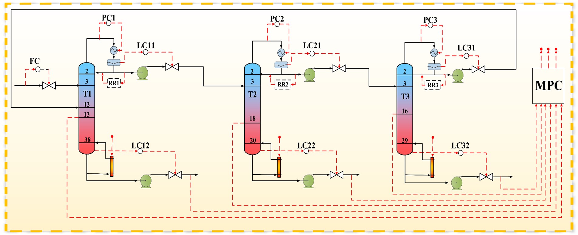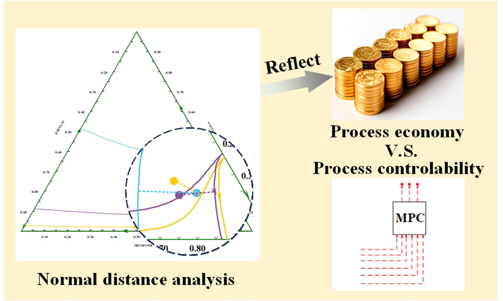 针对上述问题,清洁化工生产与过程强化创新团队李鑫副教授提出了一种基于相图中进料组成与精馏边界空间位置关系的工艺性能评估方法,引入“法向距离”作为分离效果的判别指标,量化了其与经济效益之间的关联性。通过对甲醇/乙酸乙酯/环己烷三元混合物的多序列优化与动态控制研究,明确了高-中-低压分离序列的优势,并验证了MPC控制策略在提升工艺稳定性和降低能耗方面的效果。该研究揭示了分离序列、进料组成与经济性之间的内在联系,对复杂共沸物的绿色高效分离具有指导意义。