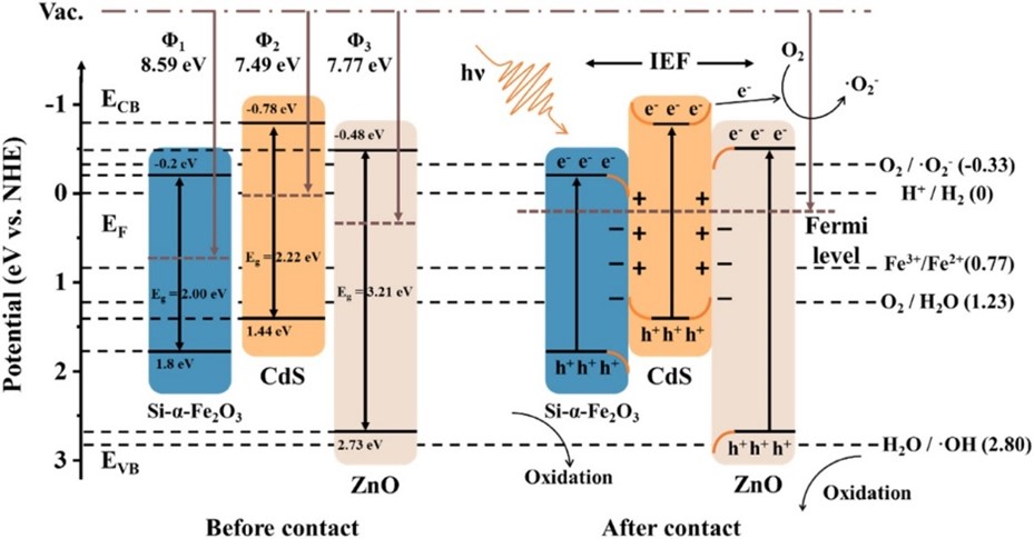 近日,365英国上市公司官网化工学院徐东彦教授在自然指数源刊、环境领域顶级期刊Water Research上发表了题为“Construction of a novel dual S-schemeCdS@Si-α-Fe2O3/ZnO heterojunction for visible-light-driven photo-Fenton degradation of ciprofloxacin”的研究论文。倪晓玺(2021级硕士研究生,北京化工大学2024级博士生)和夏龙飞(2023级硕士研究生)为论文共同第一作者,365英国上市公司官网为唯一通讯单位。