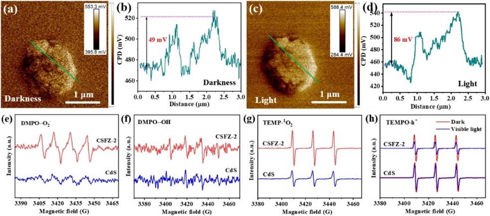 原位开尔文探针力显微镜(KPFM)分析显示,光照后材料表面电位差显著增大,证明可见光有效促进光生电荷分离,表面电荷迁移效率提升。EPR谱表明三元异质结能生成更多·OH、·O2⁻、1O2和h+;结合淬灭实验结果,进一步明确·O2⁻与1O2是降解CIP的主要活性物种,为降解路径解析提供核心依据。