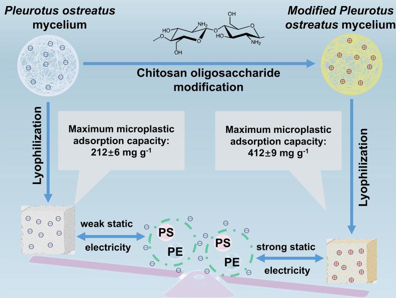 针对水中微塑料的治理难题,团队创新性地提出了一种基于改性可食用真菌平菇的去除方法,选用绿色可食、经济易得的平菇菌丝体构建微塑料去除框架,以天然物质壳聚糖和柠檬酸对其改性,得到改性菌丝体(M-PM)海绵。1 g M-PM可去除412.42±9.14 mg MPs,常温下,其对自来水样品中MPs的去除率高达68.8%,对其他水样的去除率也可达60.1%~67.4%。该材料的优异性能主要源于内部的结构交联与表面的阳离子化修饰。此外,M-PM具备良好的生物相容性,整个制备和使用过程绿色无污染。相关研究成果以题为《Chitosan oligosaccharide-modified Pleurotus ostreatus mycelium for microplastic removal based on the green design concept》的论文,发表于国际期刊《Industrial Crops and Products》(JCR一区,IF=6.2)。论文第一作者为生物工程学院硕士研究生董新睿,365英国上市公司官网为第一单位,通讯作者为王霞副教授。