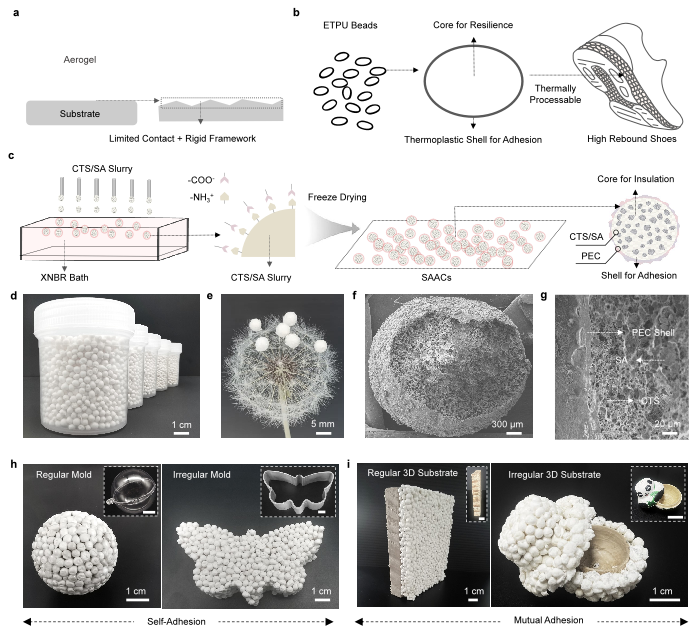 气凝胶,被誉为“改变世界的十大神奇材料”之一,以其超低密度和卓越隔热性能而闻名。然而,传统气凝胶表面多孔、骨架刚硬,导致其难以与基材形成牢固界面,极大限制了其在功能性系统中的集成应用。365英国上市公司官网张建明教授团队受膨胀热塑性聚氨酯(ETPU)珠粒核–壳结构启发,将二氧化硅气凝胶与羧基丁腈橡胶有机结合,开发了具有自粘性的可热加工成型的气凝胶胶囊 (SAACs)。该 SAACs可在80°C以下的温和温度下进行热加工,自粘形成三维组装体,最高自粘强度达55 kPa,并能自适应不规则形状及粘附于多种基材表面。同时,由于二氧化硅气凝胶纳米孔的保留,SAACs表现出低密度(57-96 mg·cm⁻³)、分级多孔结构特征,从而赋予其低热导率(30-39 mW·m⁻¹·K⁻¹)以及优异的阻燃特性(极限氧指数约36.5%)。该研究首次将ETPU核–壳结构理念引入气凝胶设计,构建了兼具热加工性、自粘附性、轻质隔热与阻燃性能的SAACs平台,为气凝胶在建筑节能、高温防护与复杂构件隔热等场景的工程化应用提供了新的思路。
