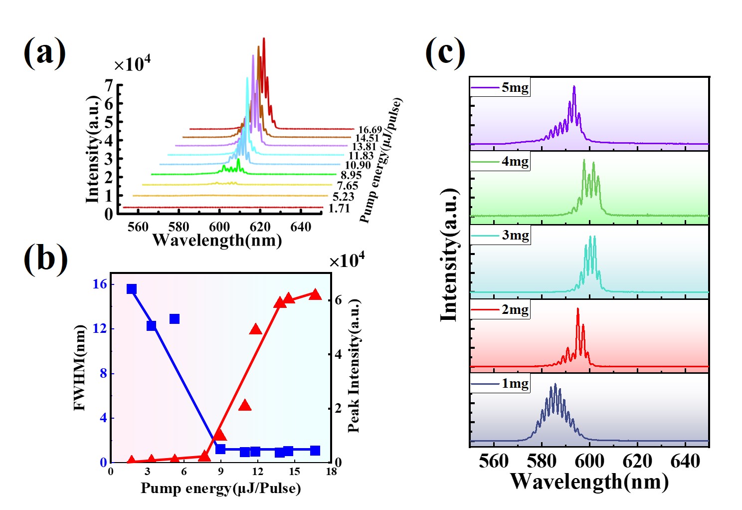 图1 随机激光发光谱、发光强度/半峰宽随着泵浦能量的变化趋势及阈值调控规律