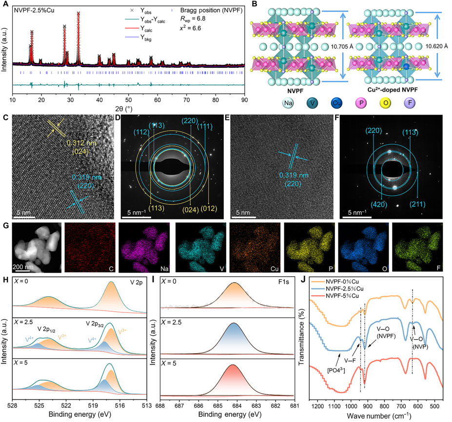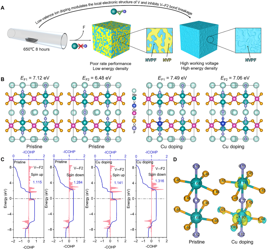 钠离子电池因工作原理与锂离子电池相近、成本更低且安全性更高,成为储能领域研究热点,Na3V2(PO4)2F3(NVPF)作为典型的聚阴离子型钠离子电池正极材料,具备三维框架结构稳定、理论比容量高(128 mAh g⁻1)、工作电压高的优势,是下一代钠离子电池正极的有力候选者,但该材料在制备过程中易发生氟流失,生成电压平台和理论比容量更低的Na3V2(PO4)3(NVP)杂相,进而拉低材料整体能量密度,限制NVPF的实际应用。现有研究多通过优化合成工艺减少氟流失,尚未从本征层面调控V─F键长和V配位环境,以提升其相纯度与能量密度。