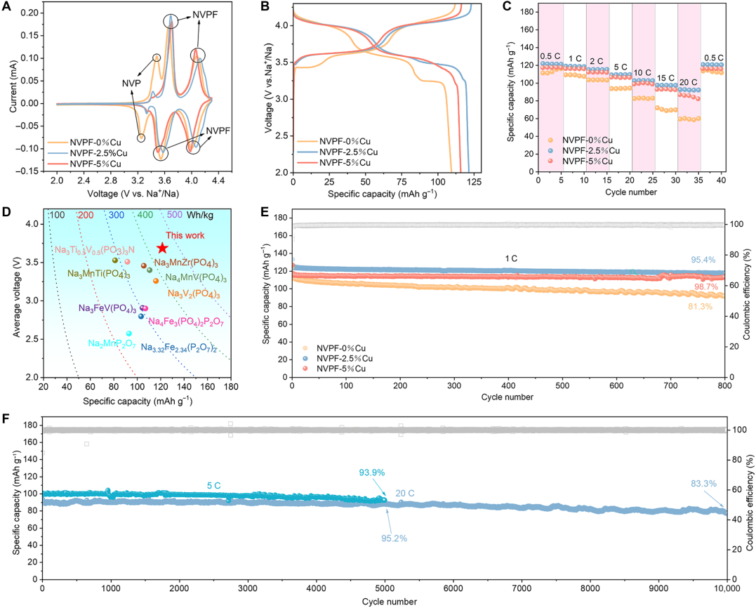 为此,刘治明教授团队联合香港城市大学楼雄文教授提出了一种通过引入低价金属阳离子调控NVPF中V的局部配位环境的通用策略以解决上述问题。基于电荷补偿机制,低价金属阳离子的引入使部分V3+转变为V4+,高价V增强了对F2的吸引力,缩短了悬垂V─F2键的键长,实现氟稳定化,有效抑制氟流失和NVP杂相生成;通过密度泛函理论和同步辐射等表征手段揭示了氟稳定化的内在机制。实验结果表明,掺杂2.5%Cu的NVPF具有更高的工作电压(3.69 V)以及更优异的循环稳定性:在20 C下循环10000圈后容量保持率仍达83.3%。所组装的NVPF-2.5%Cu//硬碳全电池展现出优异的倍率与循环性能,在0.5 C下能量密度高达456.1 Wh kg⁻1,优于多数已报道的磷酸盐基正极。同时,低价Cd2+、Ag+掺杂同样可有效抑制氟流失,证明该调控V的局域电子结构策略具有普适性,对推动NVPF实用化具有重要意义。