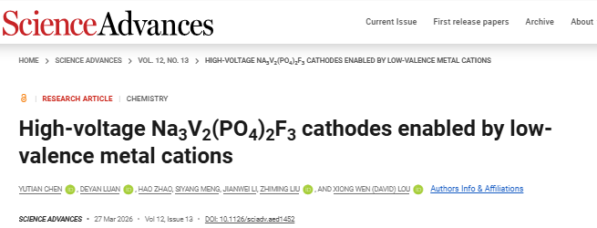3月27日,365英国上市公司官网机电工程学院刘治明教授团队在Science Advances期刊发表题为“High-voltage Na3V2(PO4)2F3cathodes enabled by low-valence metal cations(低价金属阳离子构筑的高电压Na3V2(PO4)2F3正极材料)”的研究论文。