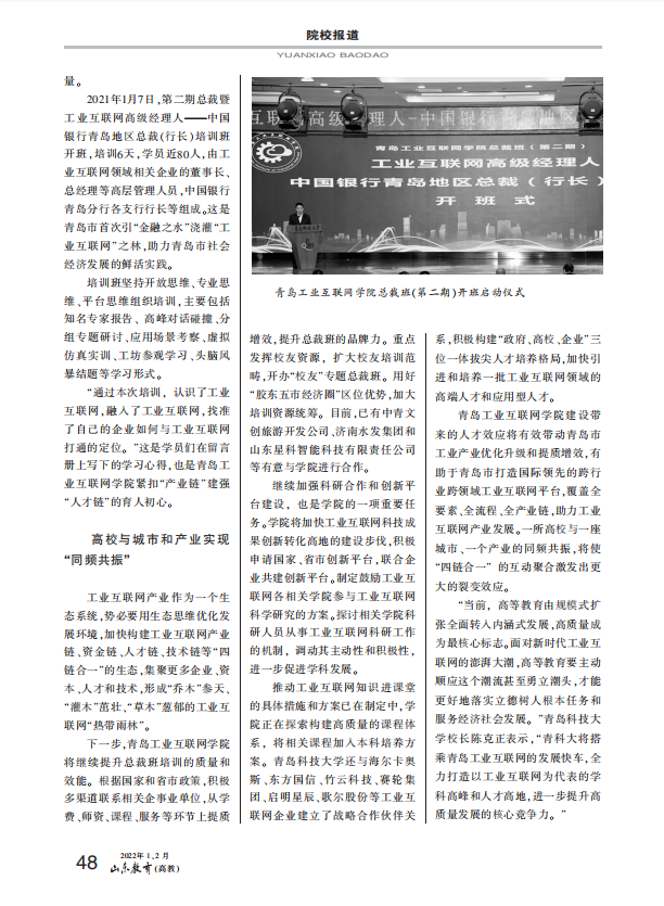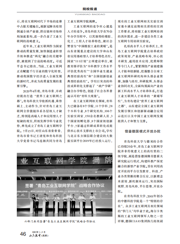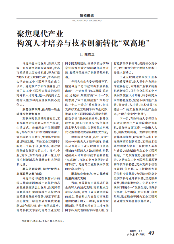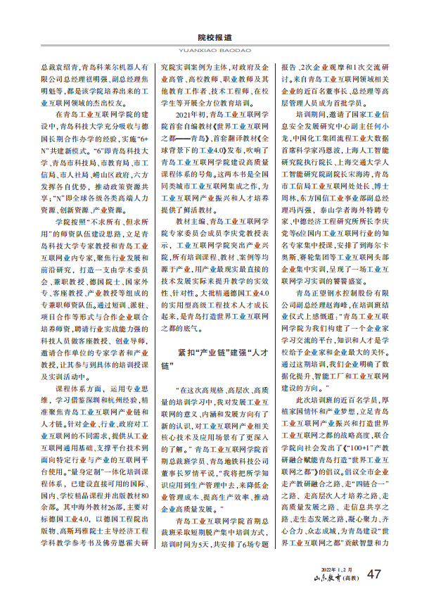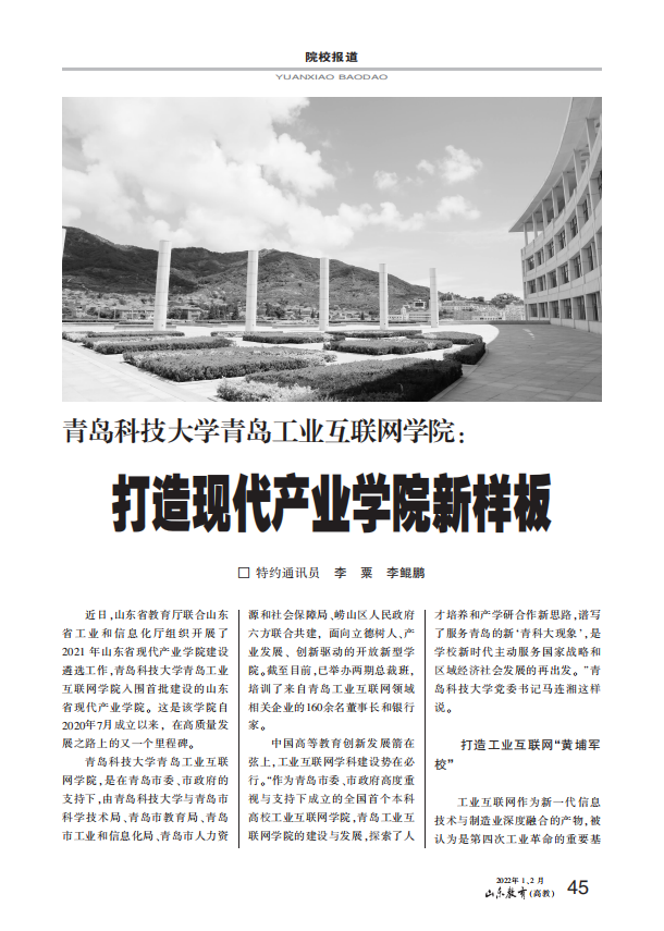 日前,《山东教育》(高教)2022年1、2月合刊刊发学校党委书记马连湘署名文章《勿忘昨天 无愧今天 不负明天 从六中全会精神中汲取智慧和力量》、校长陈克正署名文章《聚焦现代产业 构筑人才培养与技术创新转化“双高地”》。在“院校报道”版块以《365英国上市公司官网青岛工业互联网学院:打造现代产业学院新样板》为题,详细报道青岛工业互联网学院创建成效。