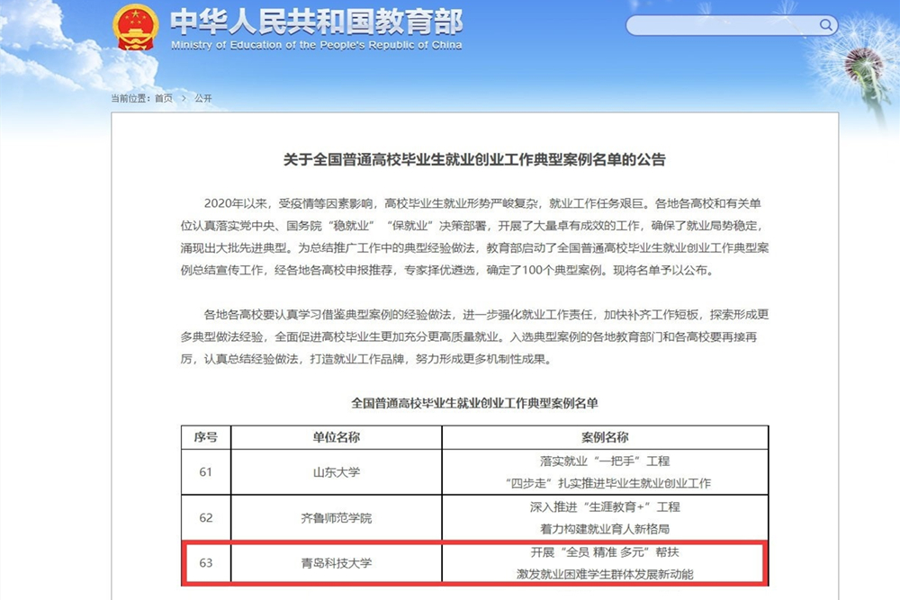 11月26日,教育部发布了《全国普通高校毕业生就业创业工作典型案例名单的公告》,我校案例《开展“全员 精准 多元”帮扶 激发就业困难学生群体发展新动能》成功入选。本次评选,全国共100个典型案例入选,入选单位包括北京市教育委员会、江苏省教育厅等5家省级教育主管部门,北京大学、清华大学等36所部属高校,29所省属本科高校和30所高职高专院校。