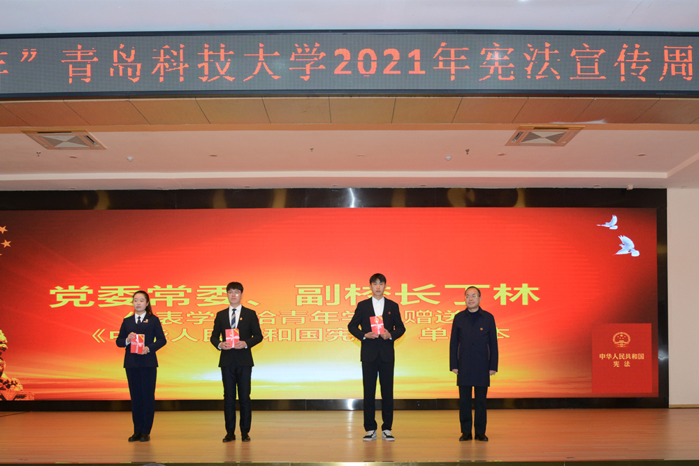 丁林代表学校为青年学生代表赠送《中华人民共和国宪法》单行本,象征着一份成人礼,希望大家加强学习,大力弘扬宪法精神、维护宪法权威,成为真正法律意义上的成年人,享有成年人的合法权利并承担法律上的责任和义务。
